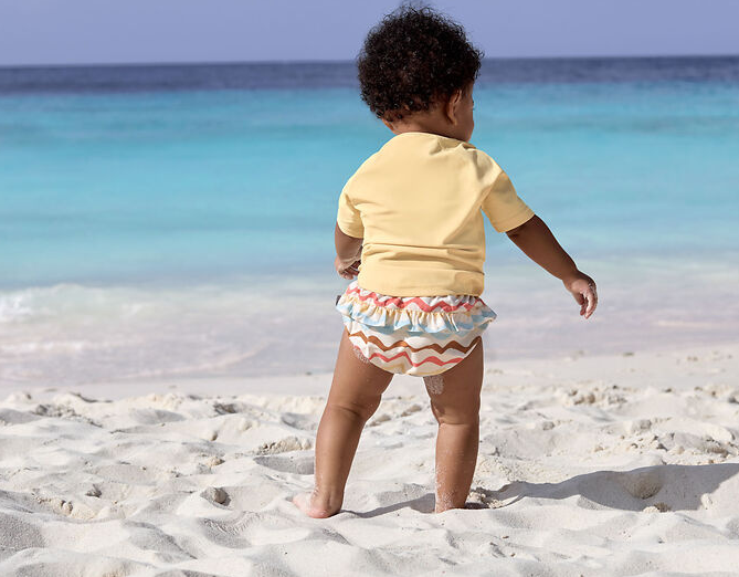 Dankzij de absorberende binnenvoering blijven billetjes droog tijdens het spelen en wordt plas netjes opgevangen. Bovendien biedt de stof UV-bescherming (UPF 50+) en is deze gemaakt van gerecycled polyester met een vuilafstotende finish. De fijne microvezelstructuur voorkomt dat zandkorrels binnendringen.